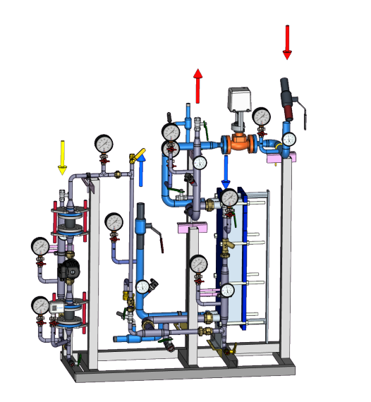 Стандартный тепловой пункт для закрытой системы ГВС с резервом теплообменников, двухходовым регулирующим клапаном, регулятором перепада давления и резервом насосов 2х100%